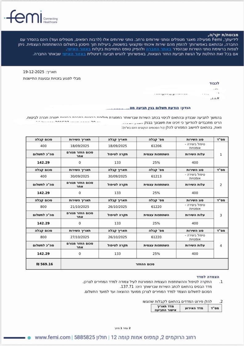 "שירות אדיב ומקצועי. קיבלנו ייעוץ מקיף על ביטוחי בריאות והצוות עזר לנו לבחור את הפוליסה המתאימה ביותר."